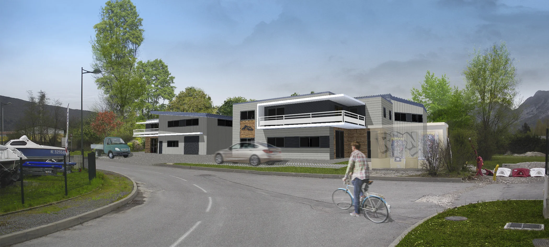 Situé dans la zone d'activité des Tuileries à Saint-Jorioz (74), ce bâtiment abrite des bureaux, un vaste espace de stockage sur deux niveaux et une habitation de fonction à l'étage supérieur.